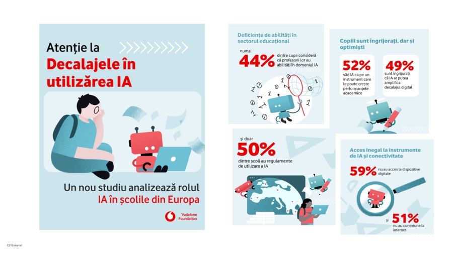 Fundația Vodafone a identificat un nou „decalaj de competențe” în domeniul inteligenței artificiale (IA) prin studiul “Inteligența artificială (IA) în școlile europene”, realizat pe un eșantion de 7.000 de elevi din șapte țări europene, cu vârste cuprinse între 12 și 17 ani. Rezultatele arată că integrarea inteligenței artificiale și a instrumentelor digitale în școli se află acum într-un moment critic și confirmă că, deși potențialul imens al inteligenței artificiale este recunoscut pe scară largă de sectorul educațional, nu există încă resurse complete sau echitabile în sălile de clasă. Concluziile principale ale studiului arată că: