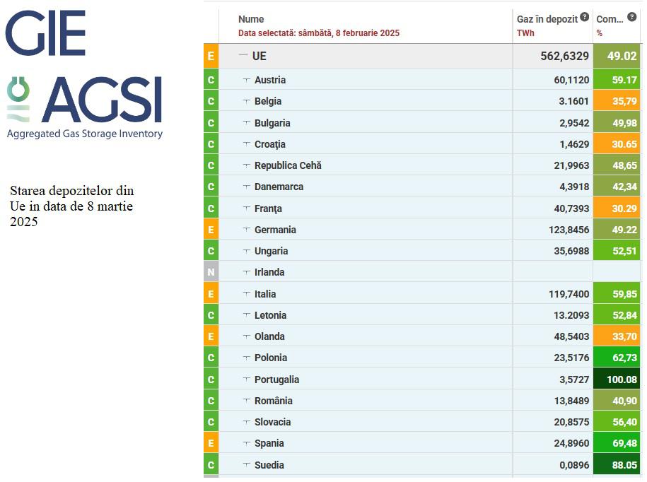 Conform datelor Asociației Operatorilor de Înmagazinare gaze Naturale din Europa – GIE, în data de 10 februarie 2025, pe baza datelor înregistrate în teren în 8 februarie 2025, la nivelul Europei gradul mediu de umplere a depozitelor este de 49,02%. România cu 40,90% se găsește pe locul 14 în rândul țărilor din UE în fața unor țări ca Belgia, Croația, Olanda, Franța.