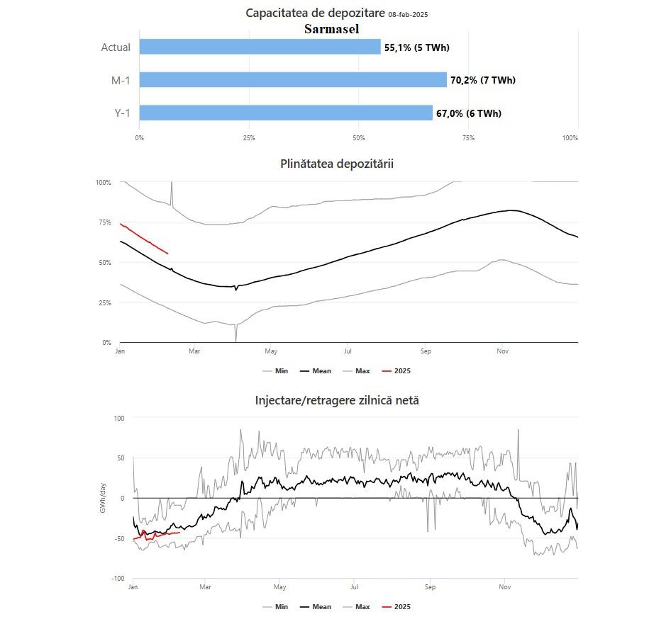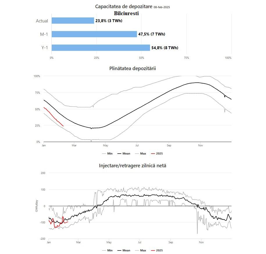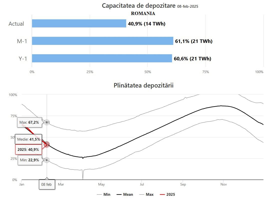 Conform datelor Asociației Operatorilor de Înmagazinare gaze Naturale din Europa – GIE, în data de 10 februarie 2025, pe baza datelor înregistrate în teren în 8 februarie 2025, la nivelul României gradul mediu de umplere a depozitelor se găsește aproape de nivelul mediu de umplere a depozitelor din ultimii ani (media gradului de umplere a fost de 41,5%, față de 40,90% în prezent).