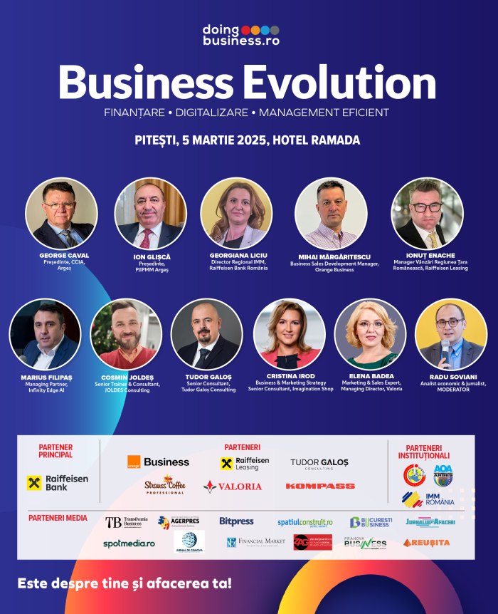 Cu o tradiție de excelență de peste 17 ani și peste 76 de ediții organizate cu succes, Business Evolution, cel mai apreciat roadshow de dezvoltare a afacerilor organizat de Doingbusiness.ro, debutează în 2025 cu ediția care va avea loc pe 5 martie la Pitești, de la 8:30 la 13:30, la Hotel Ramada