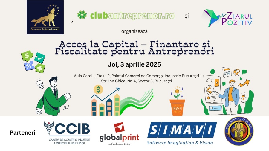 European Business LeadersClub Antreprenor și Ziarul Pozitiv au deosebita plăcere de a vă invita joi, 3 aprilie 2025, la conferința cu tema „Acces la Capital – Finanțare și Fiscalitate pentru Antreprenori”.
