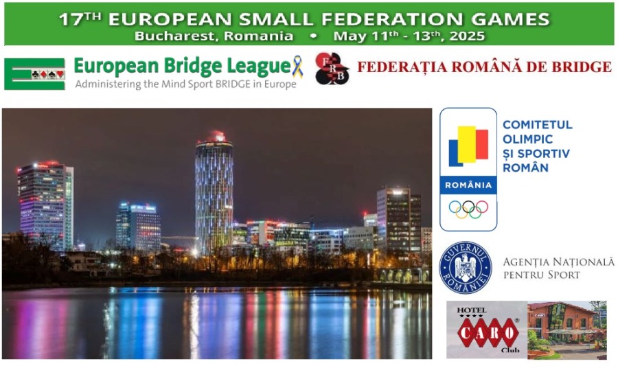 Sub egida Ligii Europene de Bridge (EBL) și a Federației Române de Bridge (FRB), cu sprijinul Comitetului Olimpic și Sportiv Român (COSR) si avizul Agenției Nationale pentru Sport, în parteneriat cu Asociația Contra Bridge Club, România va fi gazda ediției a XVII-a a Jocurilor European Small Federation Games. Evenimentul va avea loc între 11 și 13 mai 2025, la prestigiosul Hotel Caro din București și va reuni cele mai bune echipe naționale ale federațiilor europene de bridge cu un număr mai mic de 500 de sportivi.