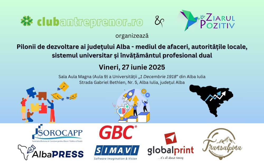 Club Antreprenor și Ziarul Pozitiv, două platforme consacrate în promovarea inițiativelor educaționale și a dezvoltării sustenabile în multiple sectoare, vă invită să participați vineri, 27 iunie 2025, la conferința cu tema „Pilonii de dezvoltare ai județului Alba – mediul de afaceri, autoritățile locale, sistemul universitar și învățământul profesional dual”.