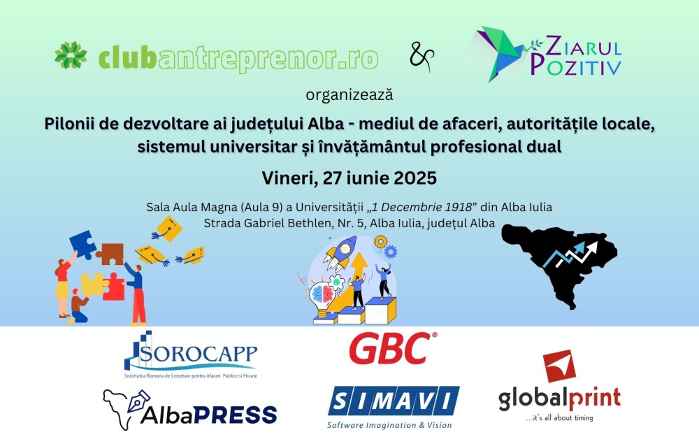 Club Antreprenor și Ziarul Pozitiv, două platforme consacrate în promovarea inițiativelor educaționale și a dezvoltării sustenabile în multiple sectoare, vă invită să participați vineri, 27 iunie 2025, la conferința cu tema „Pilonii de dezvoltare ai județului Alba – mediul de afaceri, autoritățile locale, sistemul universitar și învățământul profesional dual”.