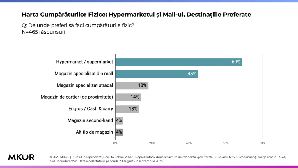 În digital, domină marketplace-urile (62%), urmate de magazinele online specializate (45%). Bucureștiul conduce la adopția hibridă, cu 52% dintre părinți alternând canalele pentru a optimiza raportul calitate-preț și stocuri disponibile.