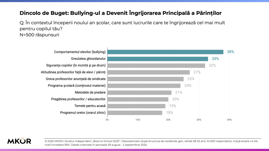 Începutul anului școlar 2025-2026 aduce o schimbare de paradigmă în rândul părinților din România: anxietățile sociale au depășit presiunea financiară. Conform studiului „Back to School 2025”, realizat de agenția independentă de cercetare MKOR, teama de bullying este acum principala îngrijorare pentru aproape 4 din 10 părinți, un semnal de alarmă care repoziționează discuția despre educație dincolo de costuri.