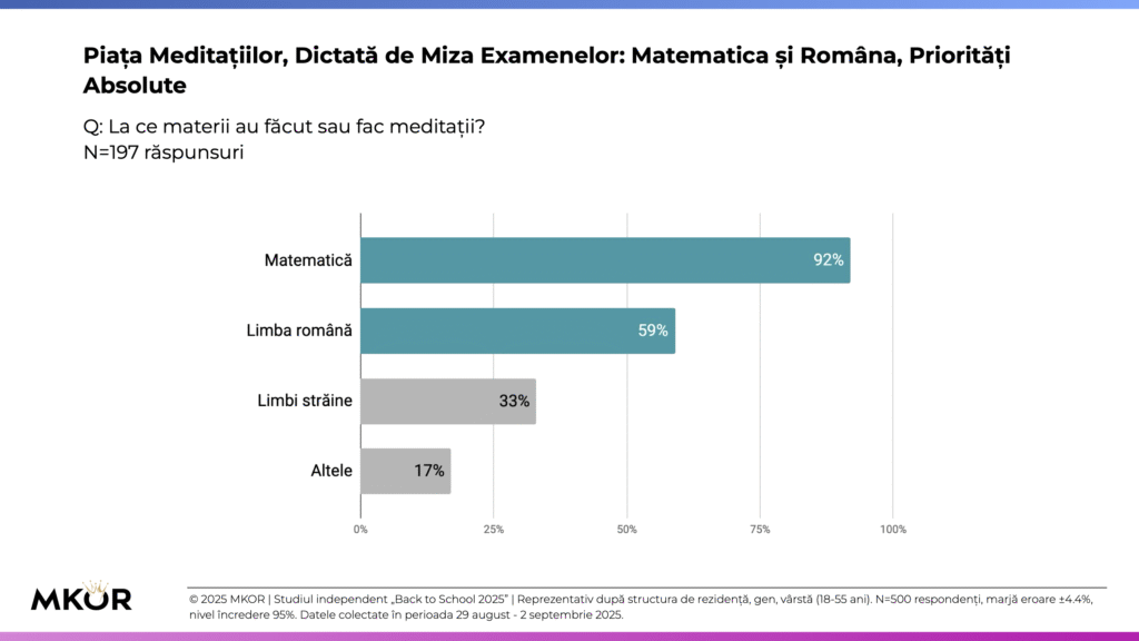 Matematica domină solicitările (92% dintre cei care fac meditații), urmată de Limba română (59%) și limbile străine (33%). Presiunea examenelor împinge fenomenul la liceu (67%) față de primar (21%), iar accesul este puternic stratificat: 58% dintre familiile cu venituri mari și 51% dintre părinții cu studii superioare apelează la meditații pentru copiii lor, comparativ cu 34% la venituri mici și 13% la studii generale – un semnal de neîncredere sistemică și de inechitate în accesul la performanță.