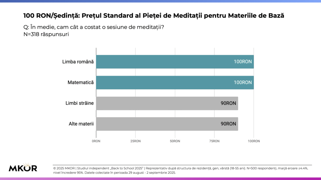 - Piața paralelă a meditațiilor s-a normalizat: 44% dintre părinți investesc în pregătire suplimentară, cu un cost mediu de 100 RON/ședință, pentru a compensa lipsurile sistemului.