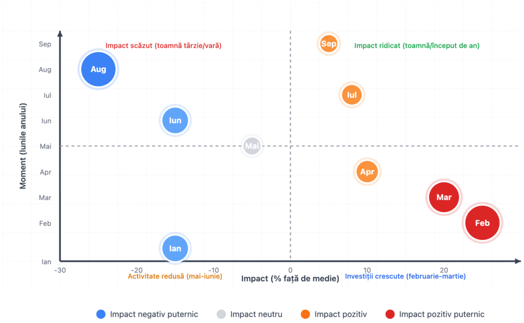 - Februarie–martie: creșteri de 35–40% față de medie, stimulate de noi bugete și granturi europene.