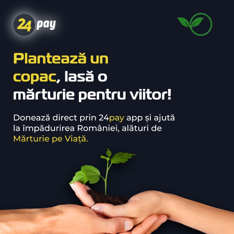 24pay facilitează susținerea campaniilor de împădurire derulate de Asociația Mărturie pe Viață, printr-o nouă opțiune integrată în aplicație. Utilizatorii au posibilitatea de a face donații direct din aplicație, contribuind astfel la inițiativele care sprijină bunăstarea comunității. Prin această funcționalitate, 24pay își consolidează rolul de aplicație pentru toate plățile și susține proiecte cu impact pozitiv în societate.