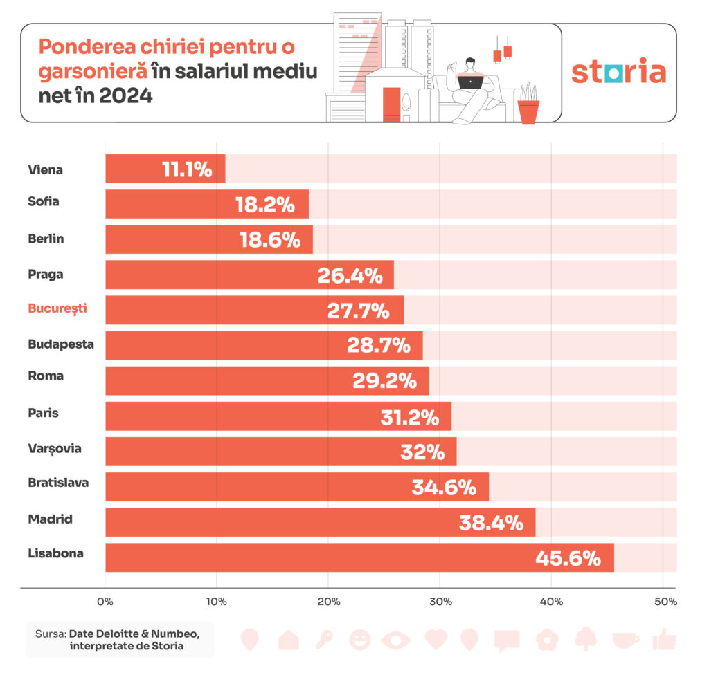 Astfel, potrivit datelor corelate din raportul Deloitte și platforma Numbeo, bucureștenii plătesc aproape 28% din salariu pentru chiria unei garsoniere. Pentru bucureșteni, ponderea chiriei în venituri este mai mare nu doar comparativ cu Sofia (18%), ci și comparativ cu Praga (26%). Valori apropiate de București se înregistrează însă și pentru locuitorii din Budapesta (29%) și Roma (29%).