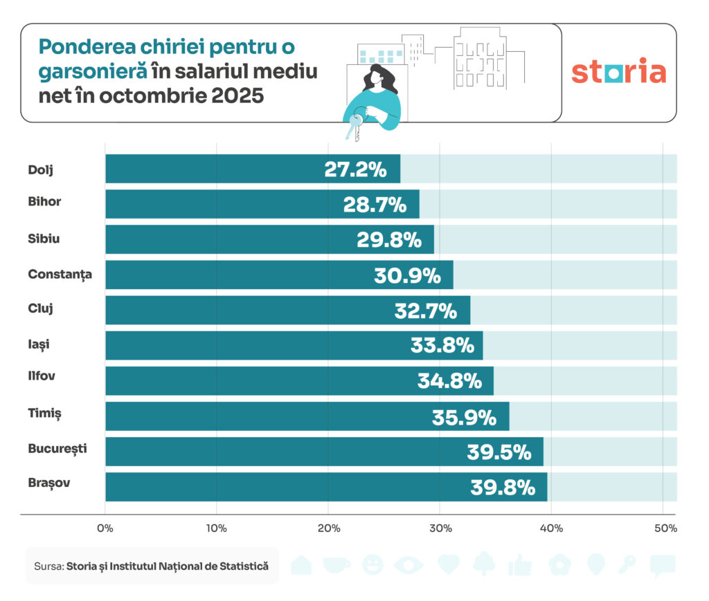 Potrivit datelor despre chiriile din octombrie 2025 și salariile medii nete din septembrie 2025, cele mai puțin accesibile chirii sunt în București și județul Brașov, acolo unde locuitorii alocă aproape 40% din salariul mediu net pentru plata chiriei.