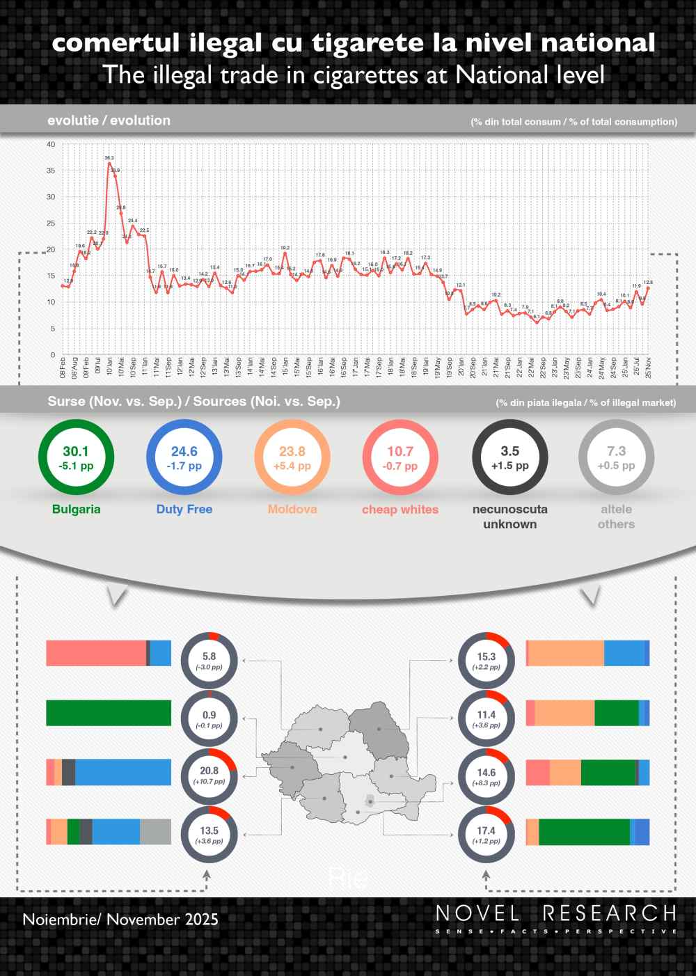 „În noiembrie, se înregistrează majorări ale comerțului ilicit în aproape toate regiunile țării. Cea mai semnificativă creștere este notată în zona de vest, de peste 10 p.p., zonă care devine astfel cea mai afectată de piața neagră, cu o pondere de 20,8%. De asemenea, în București și Ilfov piața neagră crește cu peste 8 p.p., până la 14,6%. Din punct de vedere al provenienței produselor, prima sursă pentru piața neagră din România rămâne Bulgaria cu peste 30%, deși se află în scădere cu 5,1 p.p. Ponderea produselor provenite din Republica Moldova crește cu 5,4 p.p. până la 23,8%. La nivelul întregului an 2025, media anuală pentru produsele provenite din Bulgaria se situează la 31,4%, în creștere cu 10,1 p.p. față de 2024, iar pentru cele provenite din Moldova la 17,3%, în scădere cu 3,7 p.p.”, a declarat Marian Marcu, Director General Novel Research.