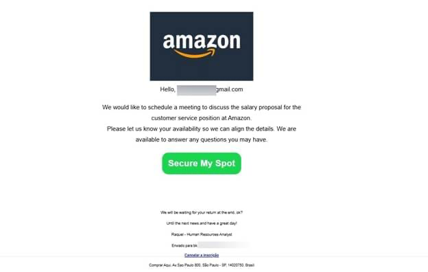 E-mailuri de tip „confirmare printr-un singur click”: vizual curate, cu puține detalii, logo-ul unei companii cunoscute, un text scurt și butoane proeminente precum „Confirmă interviul”. Unele includ chiar „mesaje vocale” pe care destinatarul nu le poate însă asculta. Mesajul duce de regulă la o pagină falsă care colectează date de acces, date sensibile sau redirecționează către conținut periculos.