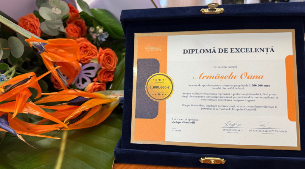 În spatele performanțelor remarcabile stau, de cele mai multe ori, ani de muncă, consecvență, adaptare și multă responsabilitate. În acest interviu, o cunoaștem mai bine pe Oana Armășelu, prima colegă din Goodwill Consulting care a atins pragul de 1.000.000 euro încasări din tariful de bază, o reușită care reflectă nu doar rezultate excepționale, ci și un parcurs construit în timp, cu seriozitate, implicare și încredere câștigată pas cu pas.